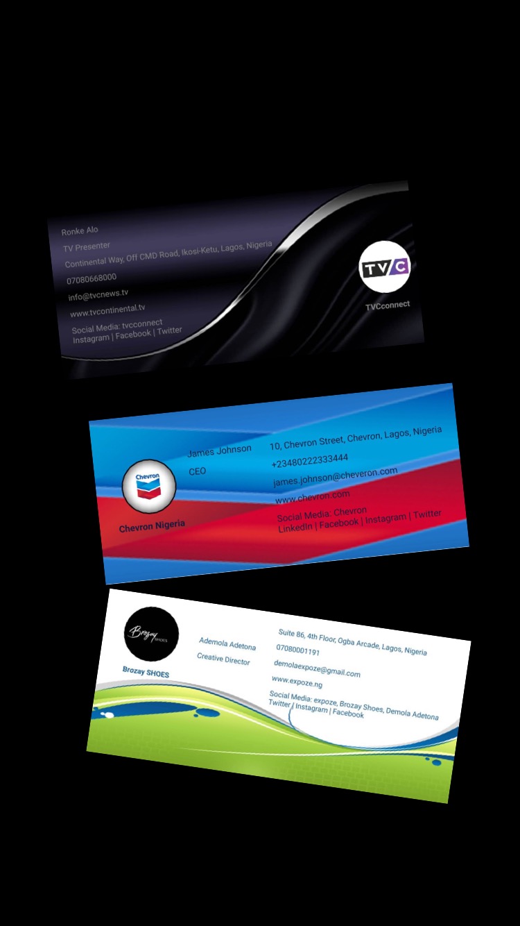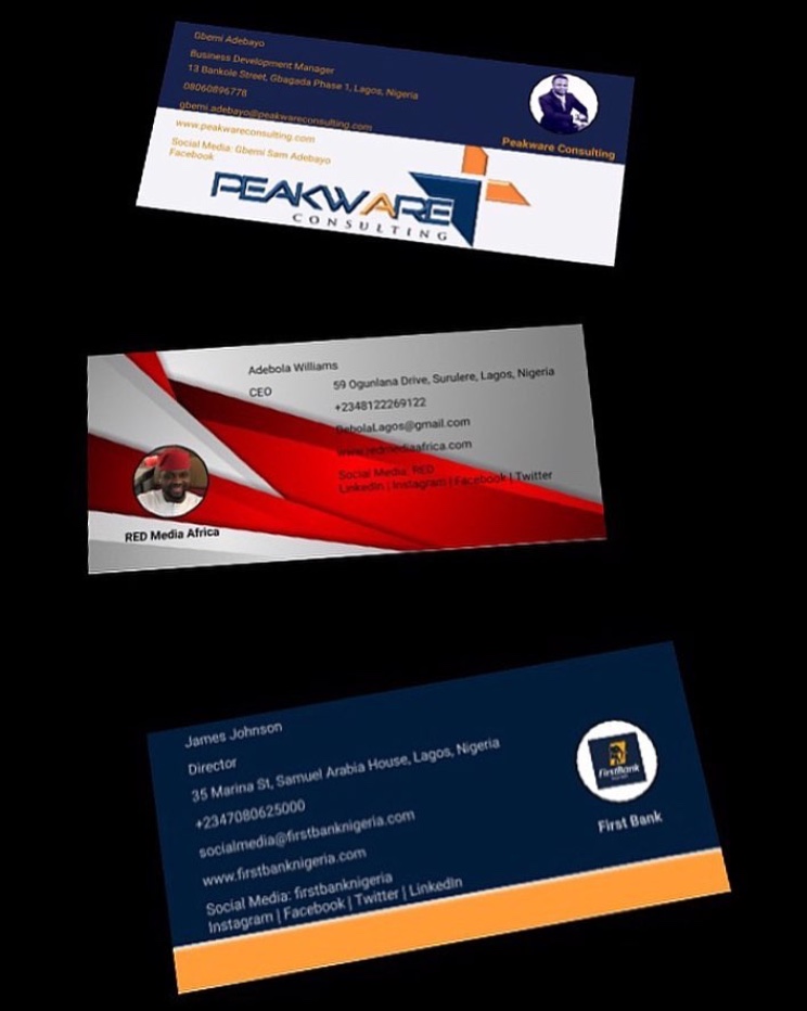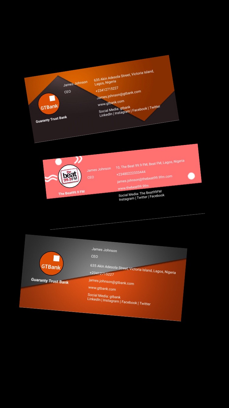 11. Recommendations – For scanning paper business card, we recommend users device to have strong camera mega pixel, the lens is kept clean and position card in good light. For designing card, it is best to design and save card in landscape layout. For card exchange via Text, ensure your network provider supports MMS. Also users to always back up their data and not delete the app from their device to avoid losing the app data saved. Cards deleted from the app can not be retrieved. However, during installation of the app, it request to access device camera and storage and if user opt for this option, the app is able to create a local folder called ‘Card Design’ on the device which will contain archive of the cards designed. The folder can be found in the device File Manager – Storage. If for any reason, the logo or photo uploaded does not appear vertical on the card designed or scanned, don’t panic. Locate the logo or photo you want to upload in your gallery and take a screenshot of it then resume the app to upload the screenshot image. Logo or photo should always be kept squared so that it appears in the center when uploaded.
